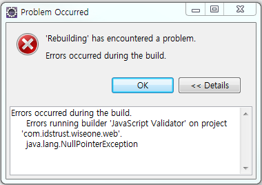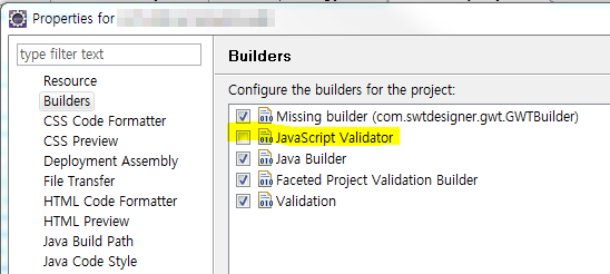 이클립스를 헬리오스로 올렸더니 자바스크립트 검증하시느라 메모리도 1기가 가까이 잡아드시고 ‘Problem Occurred’ 창을 뱉어내셨습니다. 해결책은 프로젝트의 속성에서 Builders > JavaScript Validator 체크를 해제하면 됩니다. 괜히 다른 속성 만져보고 안되서 눈물을 흘릴 뻔했습니다…