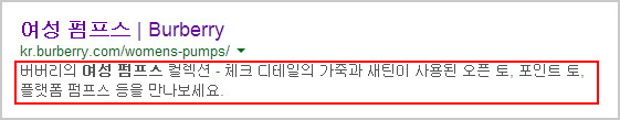 description과 같은 태그는 검색 결과에서 페이지를 설명하는 문구를 보여주기 때문에 절대 무시할 수 없는 영역이다. description 태그를 사용할 때에는 단순한 키워드의 남발이나 나열이 아닌, 실제로 소비자가 확인했을 때에 편하게 읽고 구미가 당겨 클릭하게 만들 수 있게 카피를 작성해야 한다. 물론 이 짧은 글 안에 핵심이 되는 단어가 있어야 한다는 점도 반드시 기억하자.
