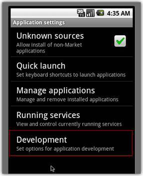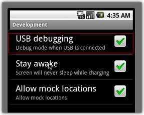 안드로이드 셋팅 > Applications(어플리케이션) > Development(개발) > USB debugging